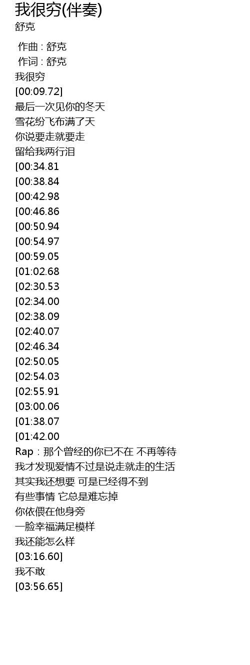 | [03:21.68][02:30.53][01:06.46] | 我很穷 没有钱 |