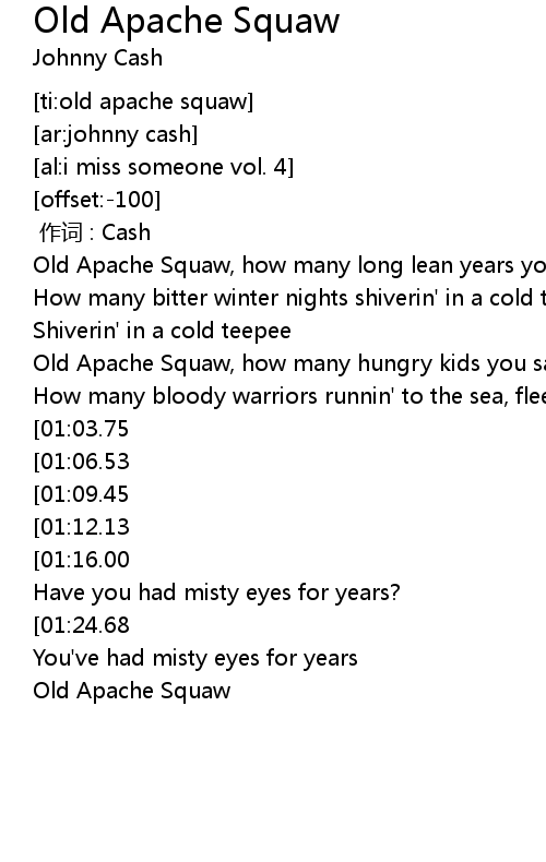 | [00:06.81] | Old Apache Squaw, how many long lean years you saw? |