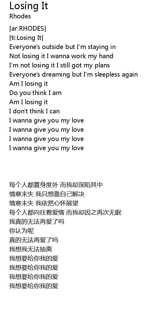 | [00:15.31] | Everyone's outside but I'm staying in |