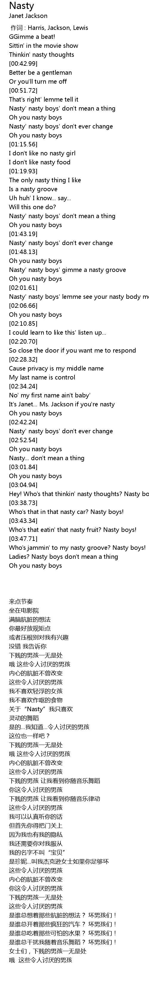| [03:48.78] | Who' s jammin' to my nasty groove? Nasty boys! |