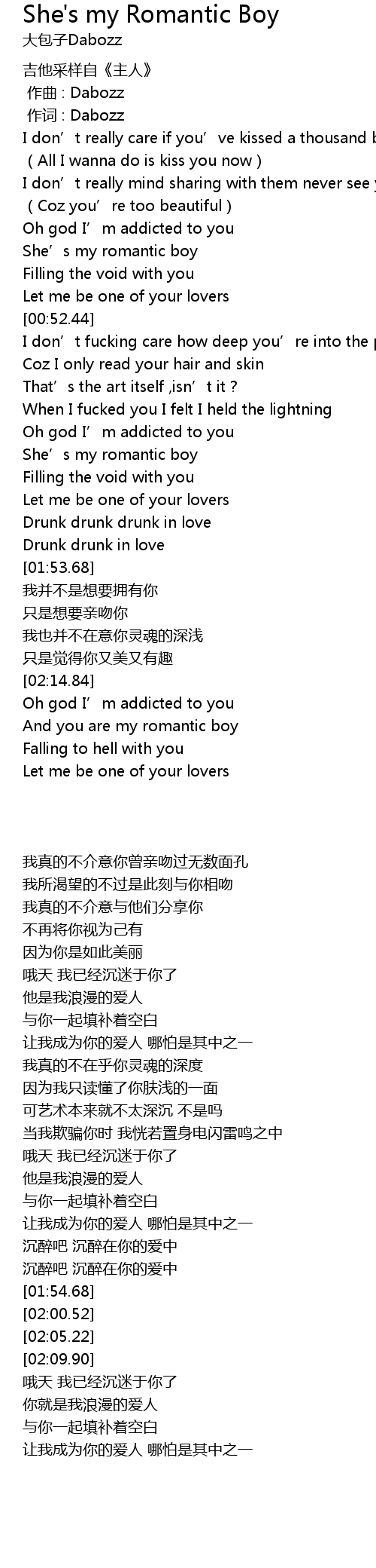 | [00:10.77] | I don' t really care if you' ve kissed a thousand boys and girls |