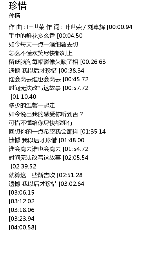 | [00:00.01]作 曲 : 叶世荣 作 词 : 叶世荣/刘卓辉 [00:00.94] [00:01.57]手中的鲜花多么香 [00:04.50]天空的烟火多么响 [00:07.60]如今每天一点一滴细致去想 [00:14.15]怎么不懂欢笑尽快都刻上 [00:19.42]留低脑海每幅影像欠缺了相 [00:26.63]沉默 我只好面对 [00:32.78]遗憾 我以后才珍惜 [00:38.34] [00:39.60]谁会离去谁也会离去 [00:45.72]谁已忘记何处继续追 [00:51.86]时间无法改写这故事 [00:57.72]让我珍惜今天所有记忆 都有你 [01:08.54] [01:10.40]多少的街中手牵手 [01:13.44]多少的温馨一起走 [01:16.50]如今说出我的感受你听到否? [01:23.09]可惜不懂给你尽快都拥有 [01:28.47]回想你的一点希望我会顫抖 [01:35.14]沉默 我只好面对 [01:41.65]遗憾 我以后才珍惜 [01:48.00] [01:48.79]谁会离去谁也会离去 [01:54.72]谁已忘记何处继续追 [02:00.79]时间无法改写这故事 [02:05.54]让我珍惜今天所有记忆 都有你 [02:20.58] [02:39.52]重拾了一些陶醉 [02:45.17]就算这一些渐告吹 [02:51.28]沉默 我只好面对 [02:57.51]遗憾 我以后才珍惜 [03:02.64] [03:31.03][03:06.15]随你离去时间也离去 [03:36.61][03:12.02]谁已忘记何处继续追 [03:42.83][03:18.06]谁也无法改写这故事 [03:48.69][03:23.94]让我珍惜今天所有记忆 [03:53.53]都有你 [04:00.58] |