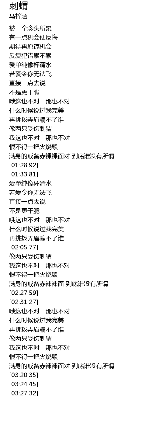 | [02:18.06] | 满身的戒备赤裸裸面 到底谁没有所谓 |
