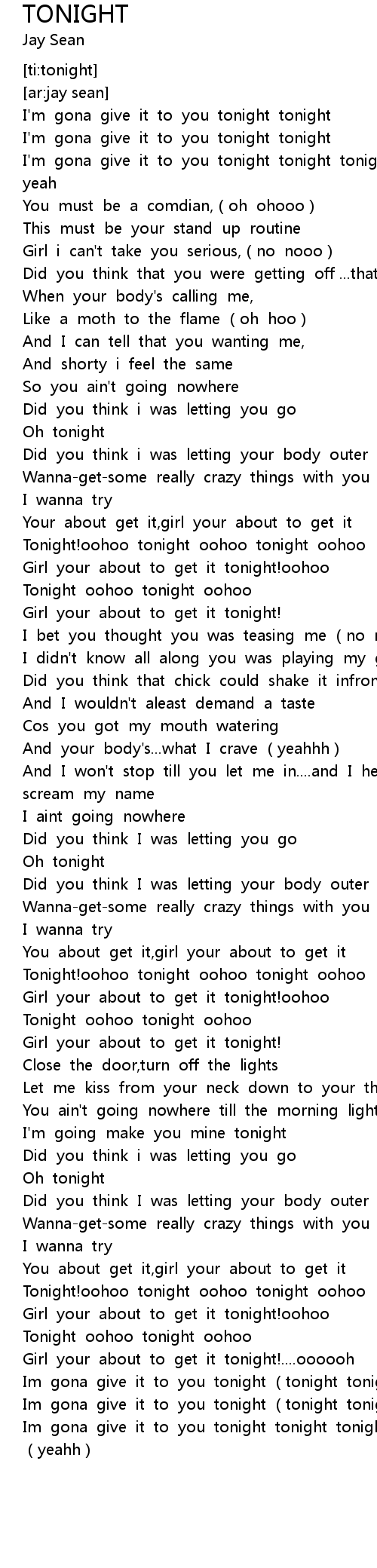 | [00:10.687] | I'm gona give it to you tonight tonight tonight tonight yeah |