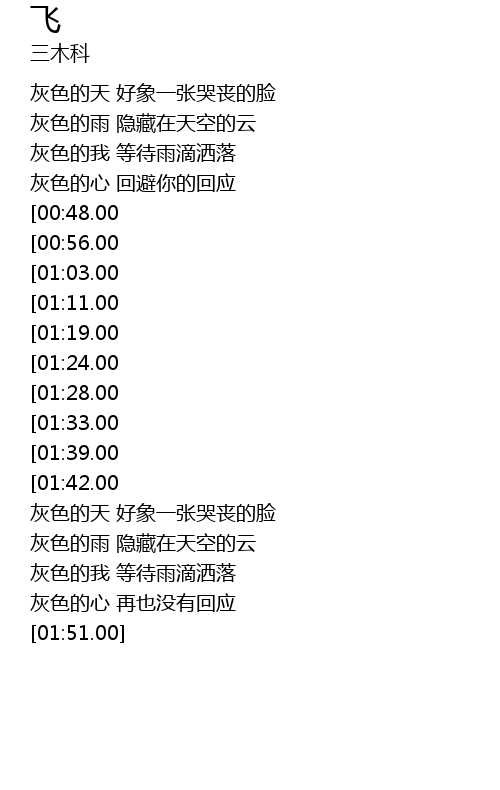 | [03:09.00][01:33.00] | wǒ fēi fēi dào tiān biān fēng lǐ pái huái |