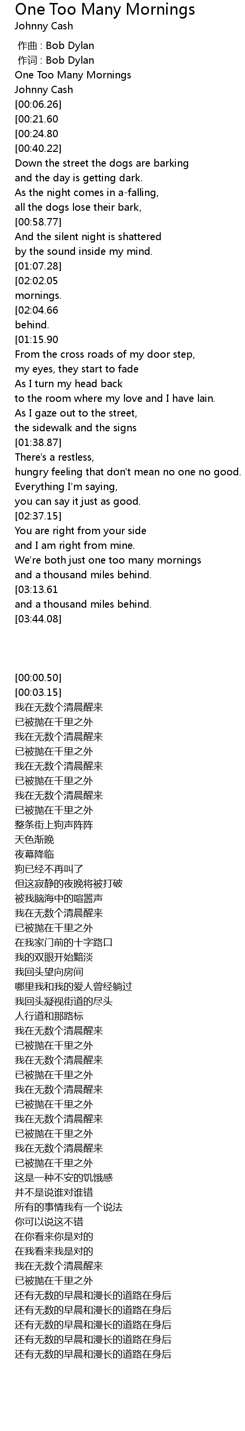 | [03:30.99][03:13.61][03:07.83][03:01.77][02:55.40] | There' s One too many mornings and a thousand miles behind. |