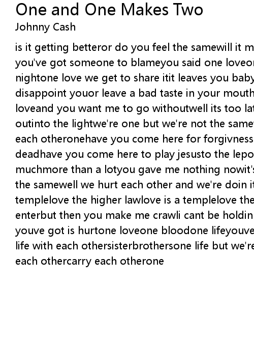 is it getting betteror do you feel the samewill it make it easier on you nowif you've got someone to blameyou said one loveone lifewhen it's one needin the nightone love we get to share itit leaves you baby if you dont care for itdid i disappoint youor leave a bad taste in your mouthyou act like you never had loveand you want me to go withoutwell its too latetonightto drag the past outinto the lightwe're one but we're not the samewe get to carry each othercarry each otheronehave you come here for forgivnesshave you come to raise the deadhave you come here to play jesusto the lepors in your headdid i ask too muchmore than a lotyou gave me nothing nowit's all i gotwe're one but we're not the samewell we hurt each other and we're doin it againyou said love is a templelove the higher lawlove is a templelove the higher lawyou ask me to enterbut then you make me crawli cant be holdin onto what youve gotwhen all youve got is hurtone loveone bloodone lifeyouve got to do what you shouldone life with each othersisterbrothersone life but we're not the samewe get to carry each othercarry each otherone |