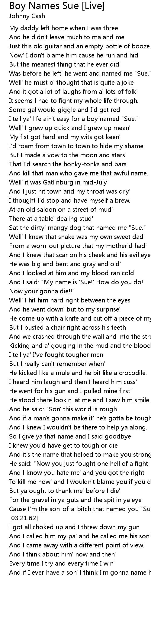 [03:16.93] Cause I'm the son-of-a-bitch that named you "Sue.'"