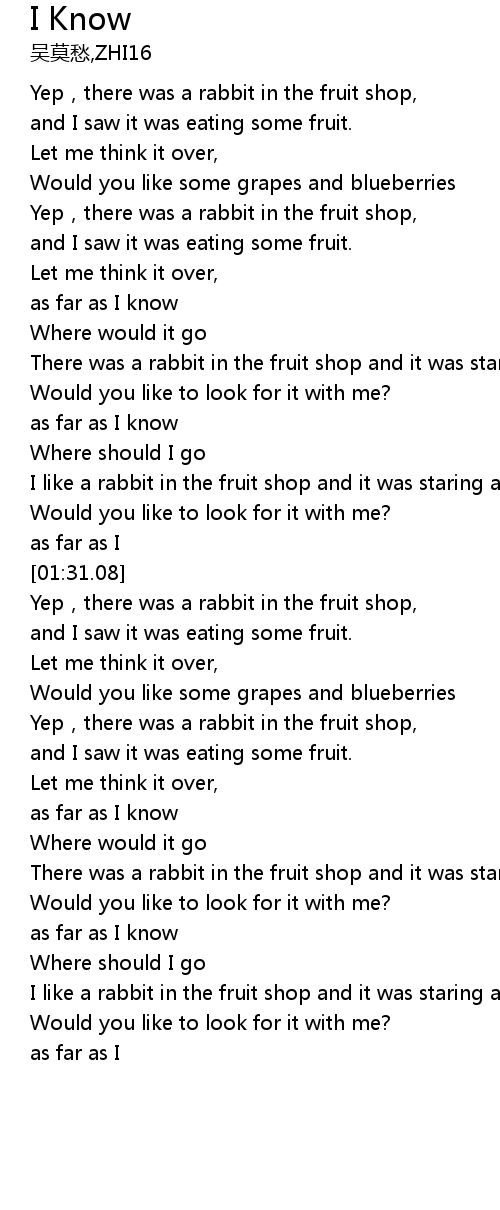 | [01:18.27] | I like a rabbit in the fruit shop and it was staring and thinking |