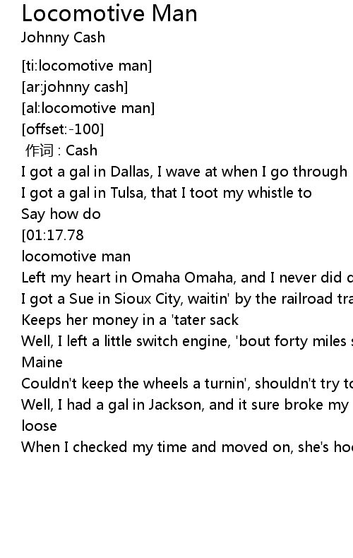 | [00:39.98][01:17.78][01:54.82][02:33.03] | I got ' em all over the land, I' m a locomotive man |