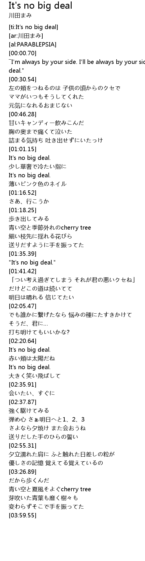 | [00:07.09] | I' m always by your side. I' ll be always by your side. " It' s no big deal." |