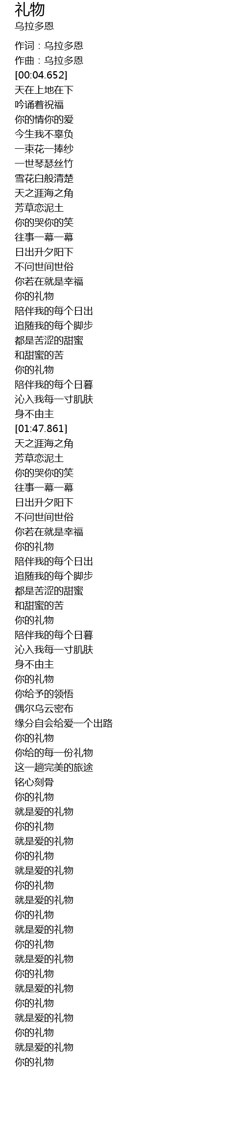 | [03:32.027] | nǐ gěi de měi yī fèn lǐ wù |