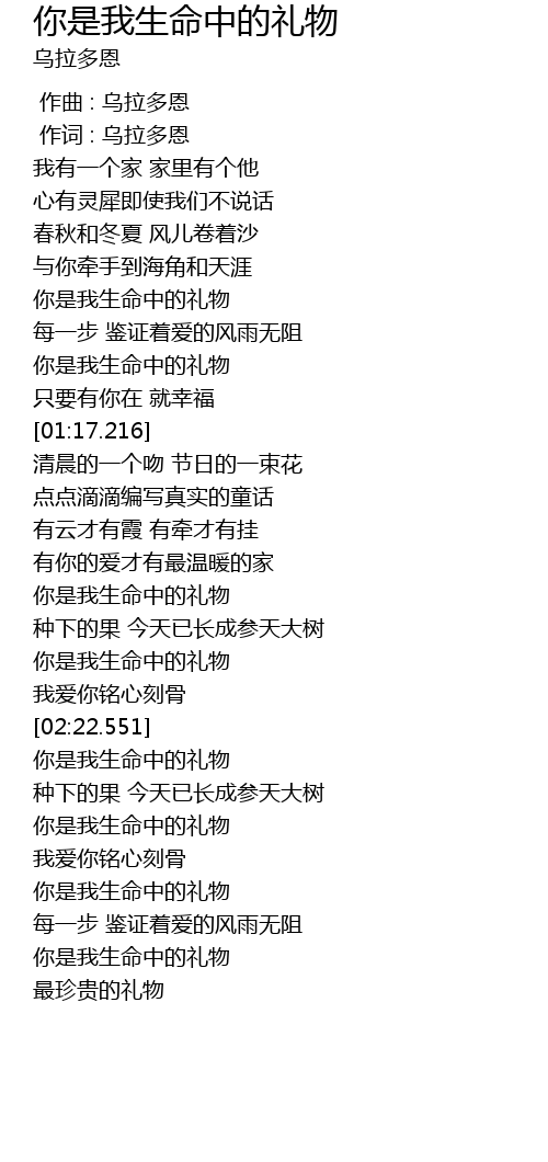 | [03:02.943] | nǐ shì wǒ shēng mìng zhòng de lǐ wù |