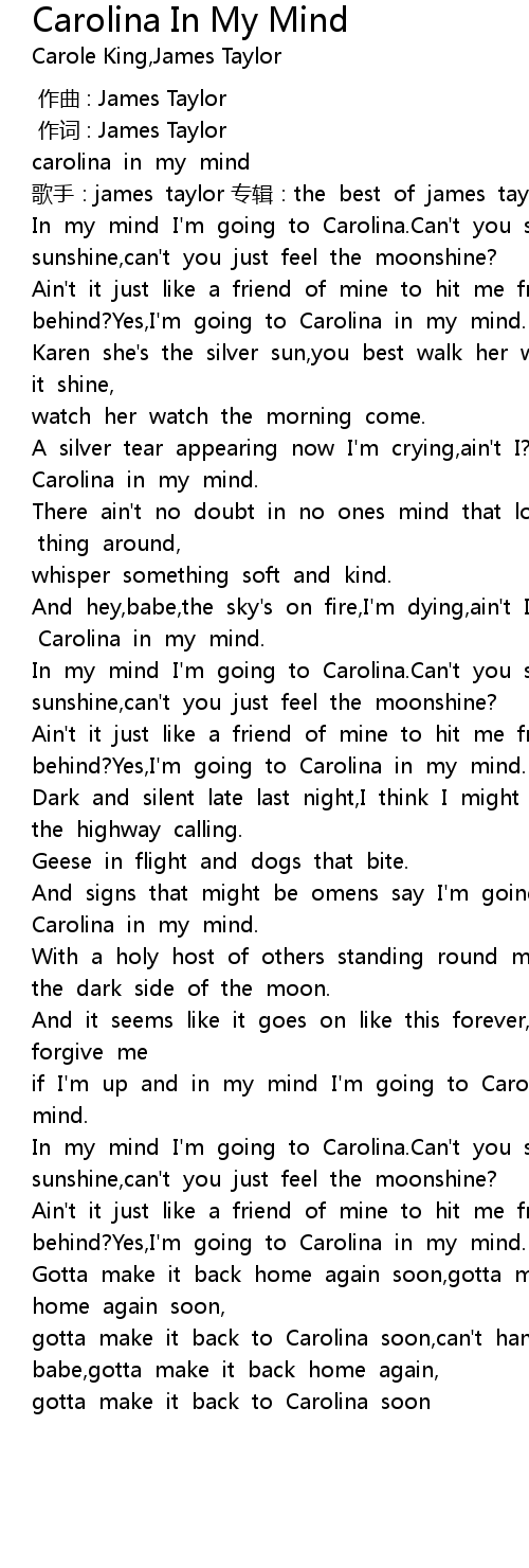 | [01:10.106] | And hey,babe,the sky's on fire,I'm dying,ain't I?I'm going to Carolina in my mind. |
