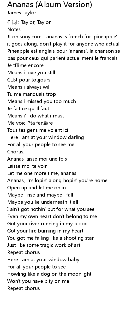 | Jt on sony. com: ananas is french for ' pineapple'. the song translates itself as it goes along. don' t play it for anyone who actually speaks french. | |