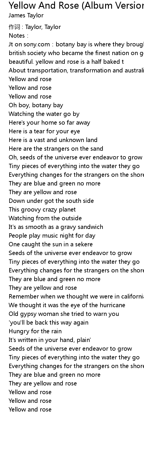 | Jt on sony.com:botany bay is where they brought the convicts. . .the dregs of british society who became the finest nation on god's green earth. . . beautiful. yellow and rose is a half baked t | |