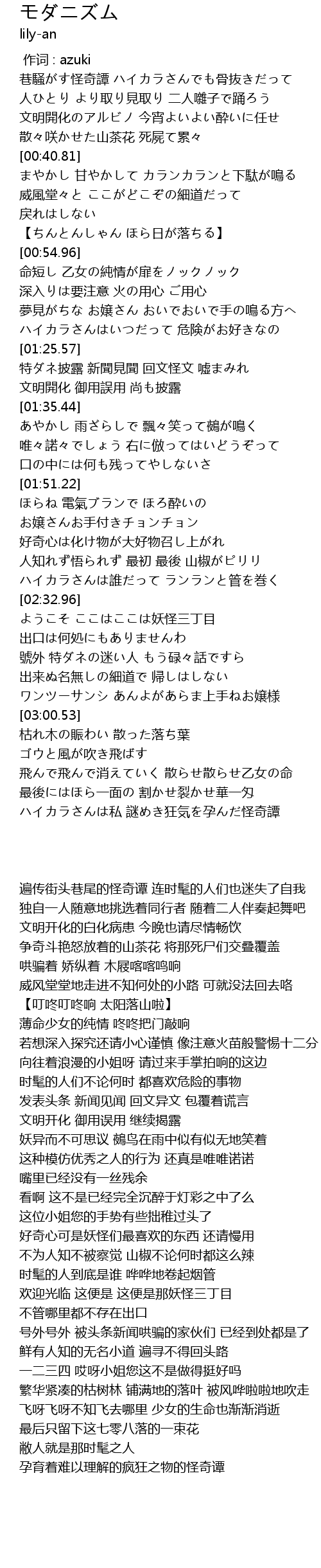 | [01:35.76] | あやかし 雨ざらしで 飄々笑って鵺が鳴く |