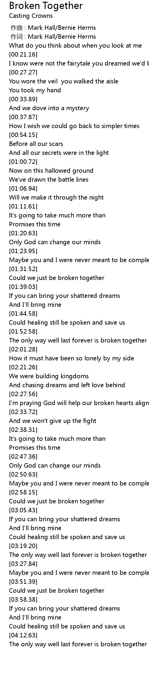 | [04:14.49] | The only way well last forever is broken together |