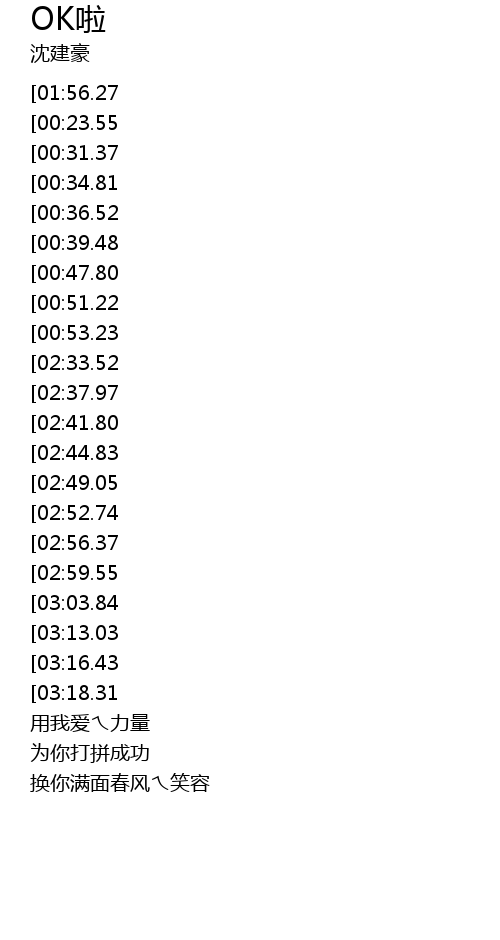 | [02:16.91][00:39.48] | OK la ài nǐ zhǐ yǒu rèn fèn wú piē bù |