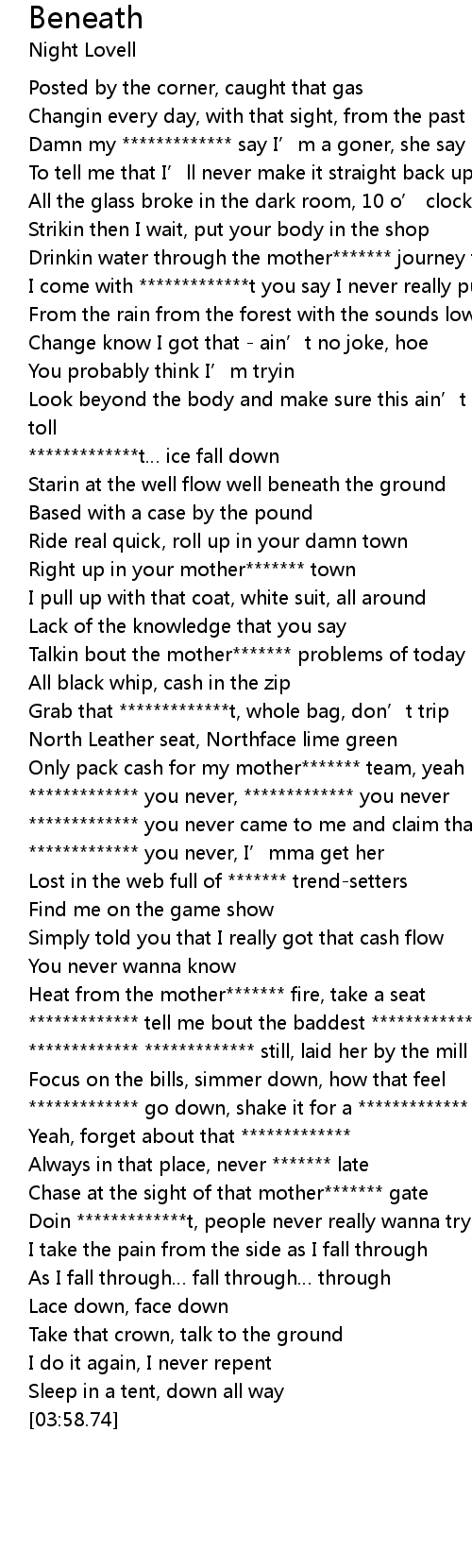 | [01:38.23] | Look beyond the body and make sure this ain’t no fi*************n toll |