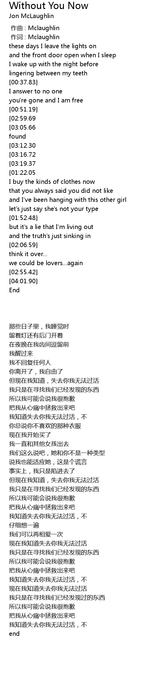 | [03:25.64][02:59.69][02:07.22][00:52.00] | and I know I can' t live without you now |