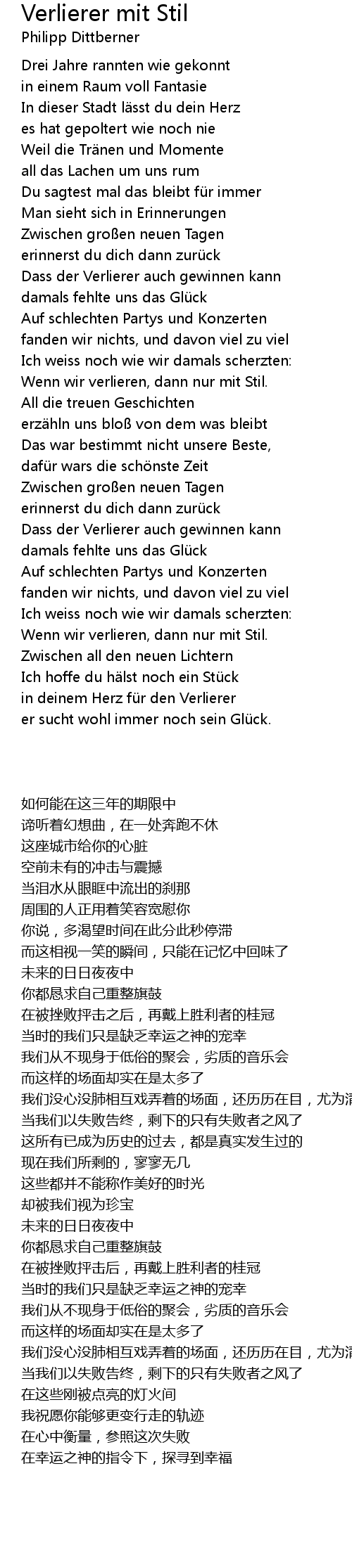 | [03:00.80] | Wenn wir verlieren, dann nur mit Stil. |
