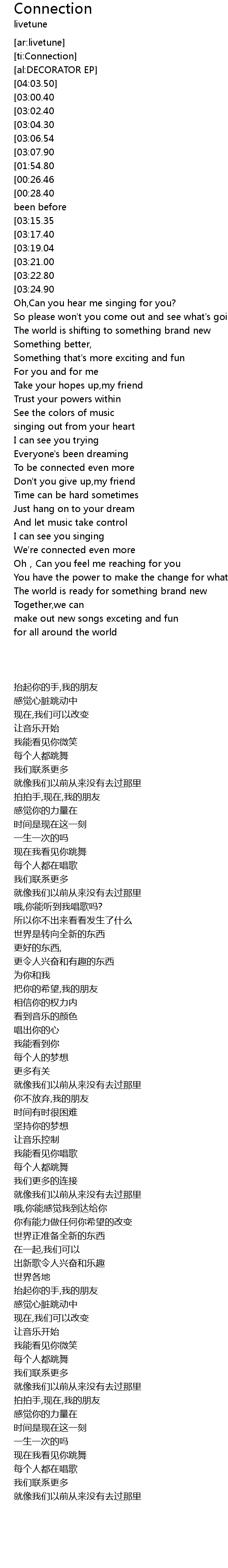 | [00:11.50][00:26.46][03:11.55][03:26.85] | We' re connecting even more |