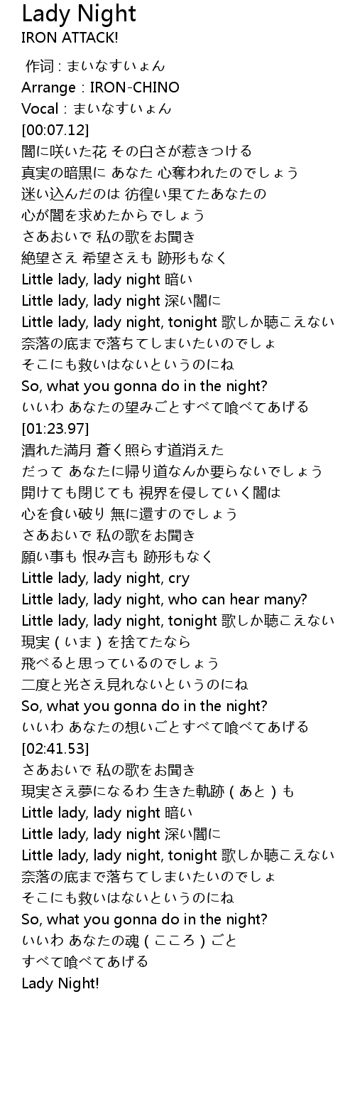 | [00:50.67] | Little lady, lady night, tonight 歌しか聴こえない |