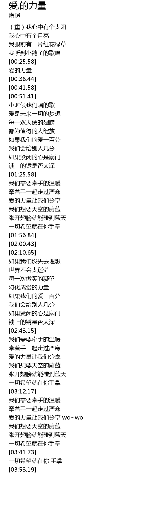 | [03:20.88] | 爱的力量让我们分享 wo~wo |