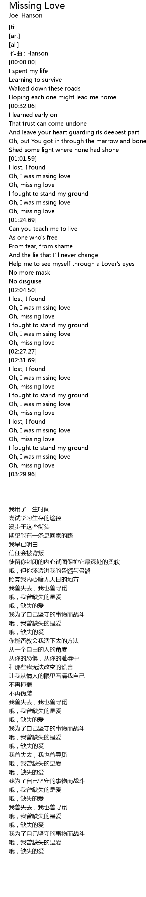 | [03:22.36] | Oh, I was missing love |