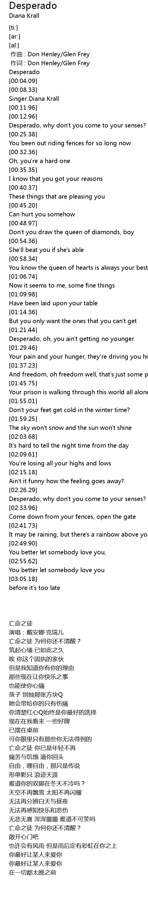 | [02:26.54] | Desperado, why don't you come to your senses? |