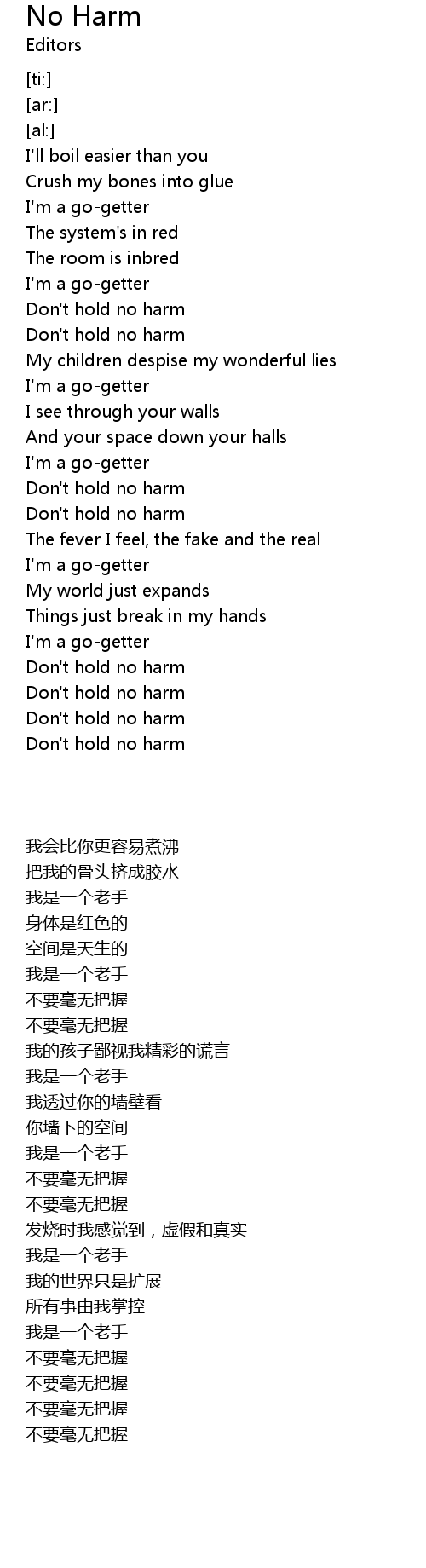 | [01:32.88] | Don't hold no harm |