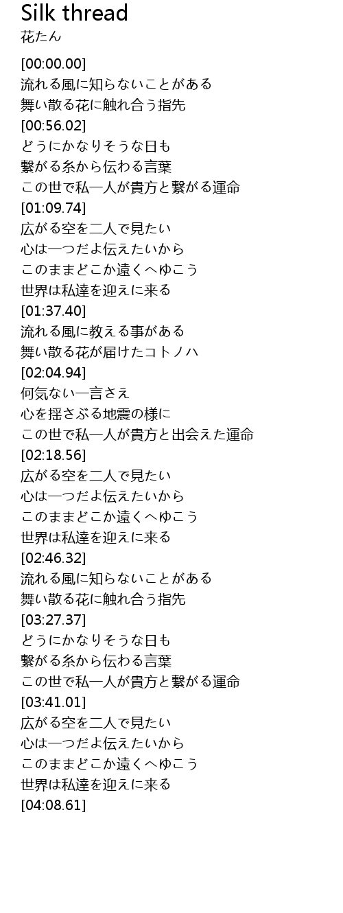 | [00:59.56] | 繋がる糸から伝わる言葉 |