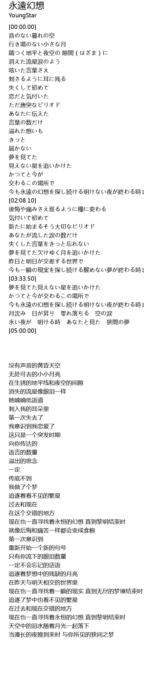 | [04:14.84] | 今も永遠の幻想を探し続ける明けない夜が終わる時まで |