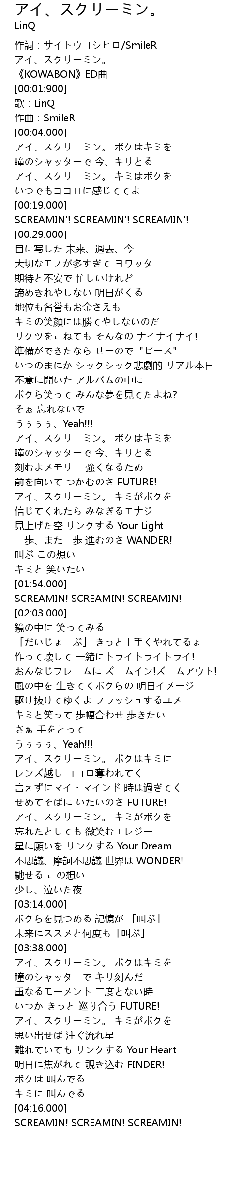 | [02:00.500] | SCREAMIN! SCREAMIN! SCREAMIN! |