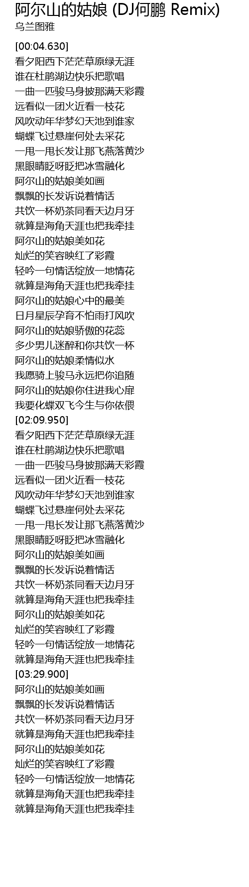 | [03:54.030] | 阿尔山的姑娘美如花 |