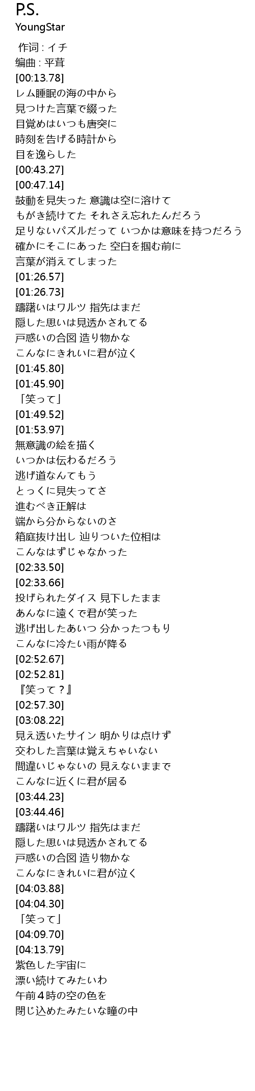 | [00:50.75] | 鼓動を見失った 意識は空に溶けて |