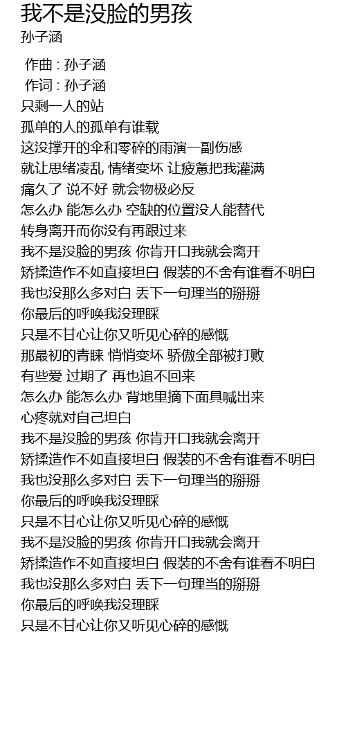 | [03:02.590] | 我不是没脸的男孩 你肯开口我就会离开 |