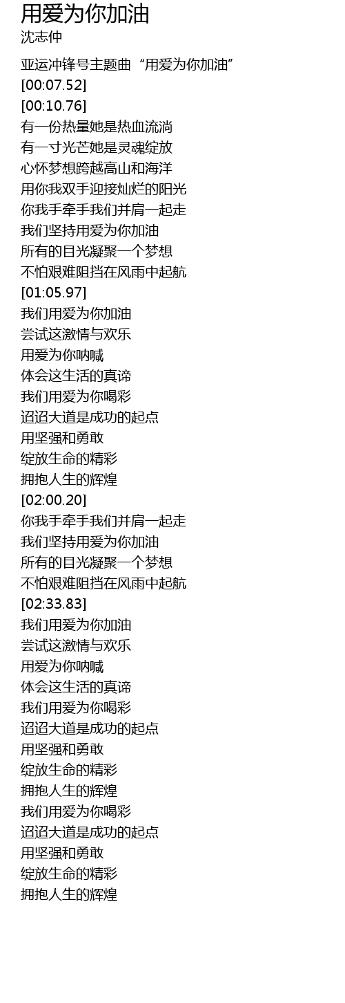 | [00:03.84] | 亚运冲锋号主题曲“用爱为你加油” |