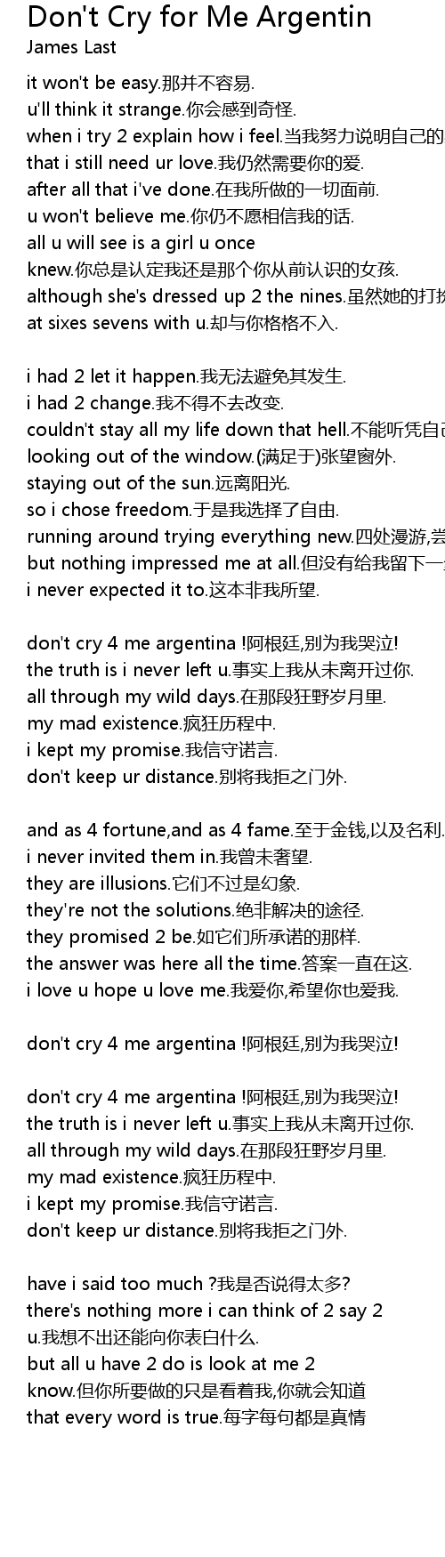 | don' t cry 4 me argentina ! ā gēn tíng, bié wèi wǒ kū qì! | |