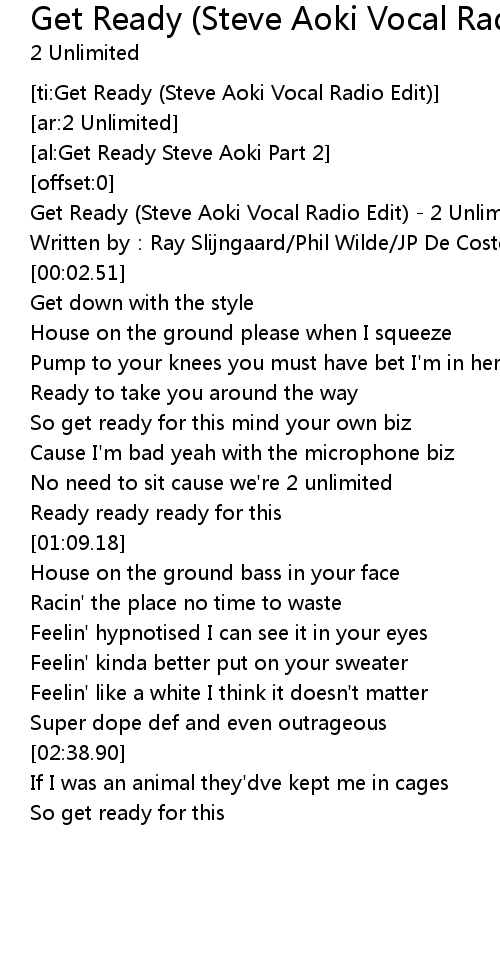 | [00:00.09] | Get Ready (Steve Aoki Vocal Radio Edit) - 2 Unlimited |