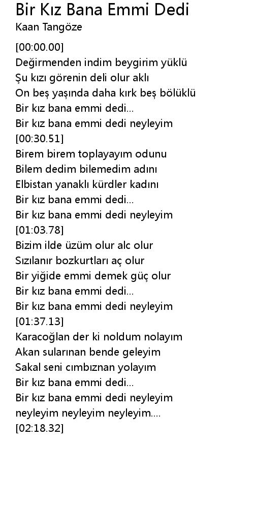 | [00:57.67] | Bir k z bana emmi dedi neyleyim |