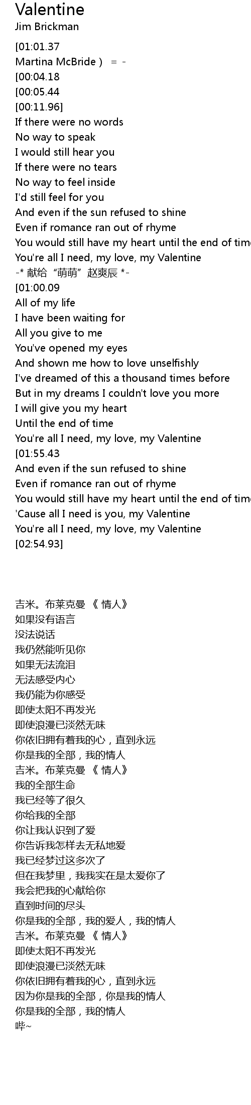 | [01:56.67][01:01.37][00:00.04] | -= Jim Brickman 《 Valentine 》(feat. Martina McBride) =- |