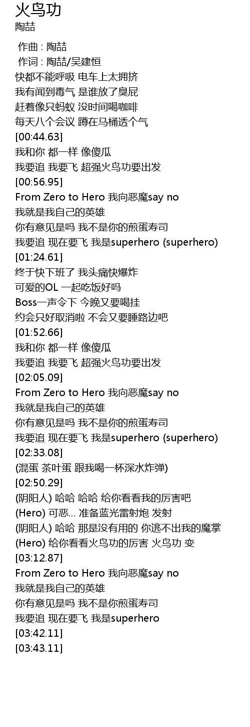 | [03:08.82] | Hero gěi nǐ kàn kàn huǒ niǎo gōng de lì hài huǒ niǎo gōng biàn |