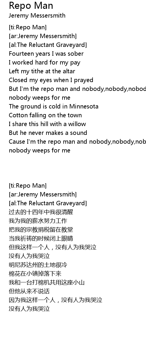 Cause I'm the repo man and nobody,nobody,nobody weeps for me |