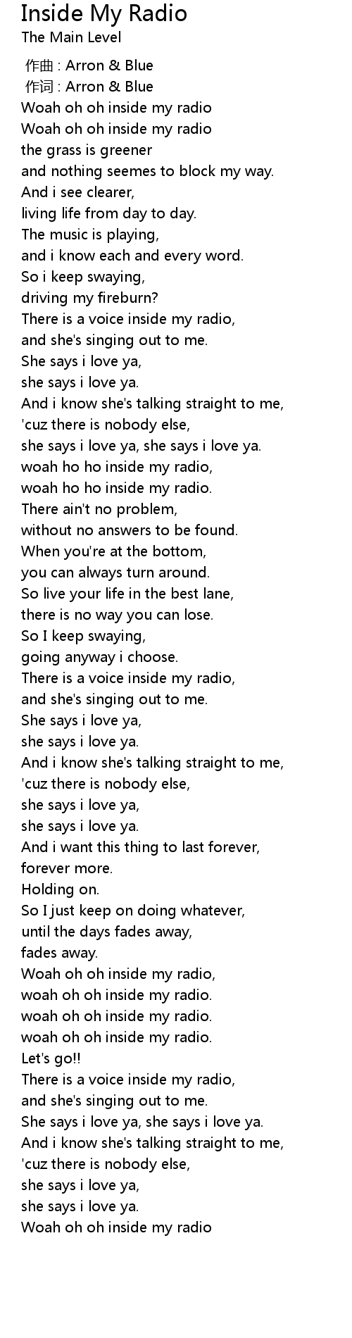 | [00:03.54] | Woah oh oh inside my radio |