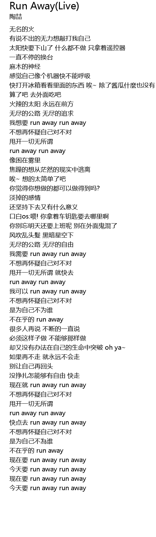 | [03:24.290] | 现在就 run away run away |