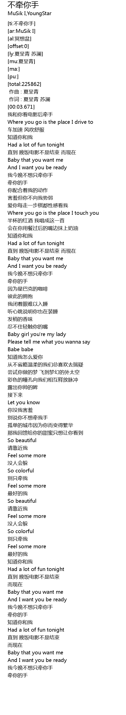 | [00:52.651] | wǒ jīn wǎn bù xiǎng zhǐ qiān nǐ shǒu |