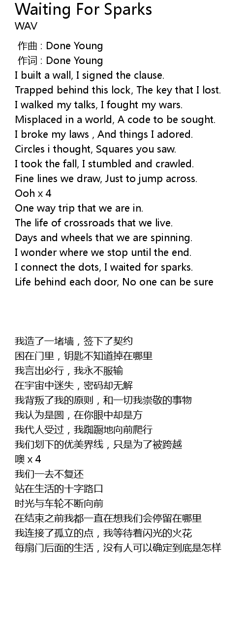 | [02:00.33] | I connect the dots, I waited for sparks. |