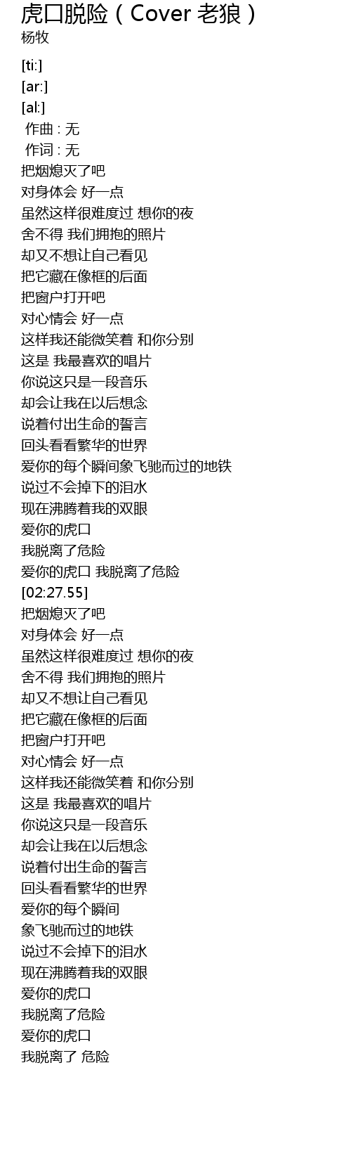 | [02:19.78] | 爱你的虎口 我脱离了危险 |